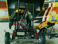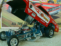 ship over to the floppers. Back to the models, I must admit that I have a soft spot for any cars that have been sponsored by toy companies (Cox and Chaparral would be a case in point) because it guarantees that a decent model will be forthcoming. The early Hotwheels models, and indeed the Monogram kits, were good but not entirely accurate in that they used a chassis that differed only in the injector intake. The Legends models again, as per the prototypes, share a large number of common components but there are noticeable differences between the two such as the fuel tanks. As first generation flip-top funnies it was thought at the time that both front and rear suspension was required and indeed this has been incorporated in the models. Other touches that stand out are the braided fuel lines with blue/red "Aeroquip" colour fittings and wiring and control linkages. Overall these models have been manufactured to an exceptionally high level and it is also true for the accompanying 1/64 scale pieces (which simply should not be compared to the old red-line racers which are fun to own but not very well detailed - as a piece of trivia I recollect a short drag racing documentary film in which McEwen is surrounded by boys, he asks them whether they have the Hotwheels toys and then goes on to ask which one was faster, they all say the Snake which was also true for mine). If there is a fault with the models it is that they have chosen to use the later versions with the all too obvious roof spoliers, spoilers is certainly the right term as both the Duster and Barracuda bodies looked better without them and I have absolutely no idea why Mattel did not opt for the cleaner original versions. . £ 53-99 each, inclusive of postage to UK addresses, bear in mind that these were issued at $120 stateside and you might agree that they are now something of a bargain for the larger diecasts, and of course you get the smaller models as well. (No I don't want to sell the old race set) Home |